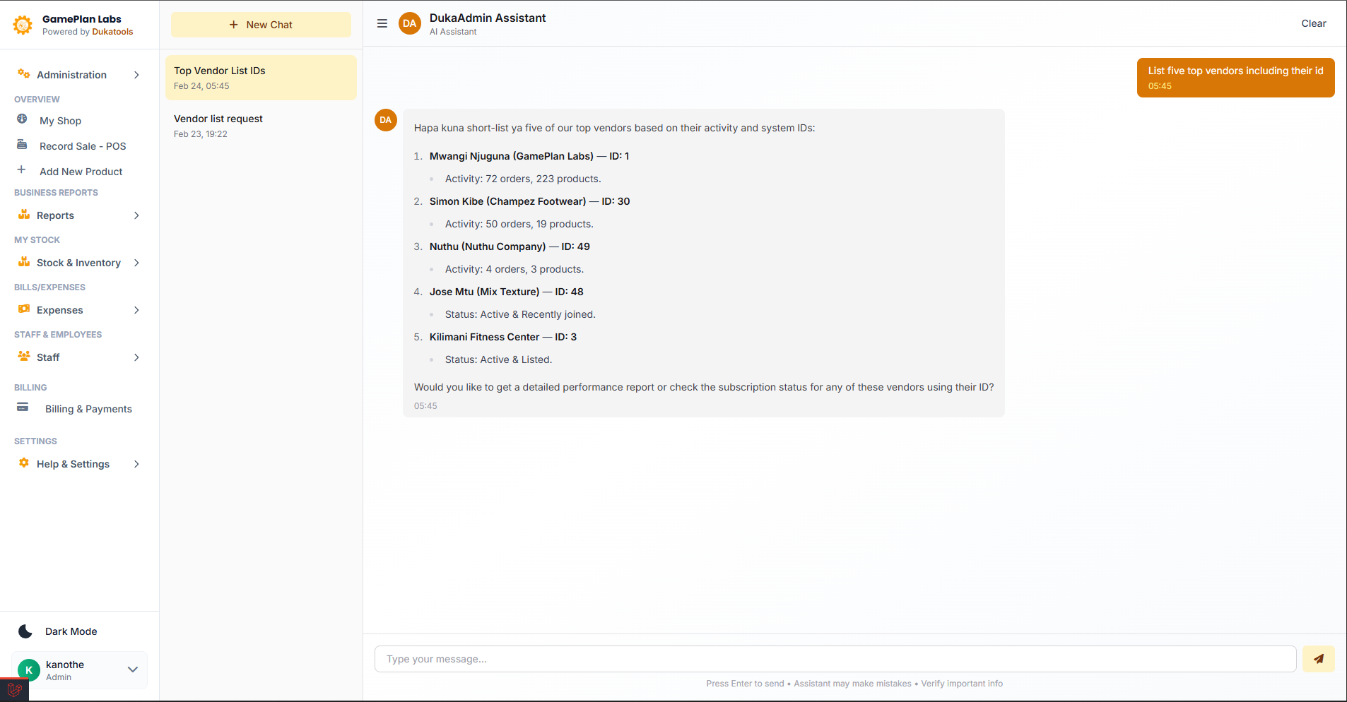 Early this week, we deployed the Dukatools AdminAssistant. It is our first official AI agent. It now lives inside the Dukatools admin dashboard and helps the platform team (and soon every business owner on the system) handle reports, vendor stats, low-stock alerts, and more, all by chatting naturally.